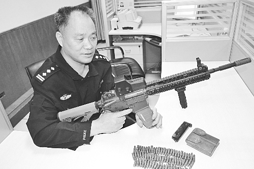 石家庄市公安局桥东分局彭后街派出所积极开展危爆物品大检查大整治活动。社区民警在深入开展摸排清查的同时,通过张贴标语、悬挂条幅、发放宣传单等多种方式,全方位、多角度地广泛宣传,有效提升了群众的安全防范意识,辖区群众主动上缴手枪子弹80发。图为10月5日,民警展示依法收缴的居民私藏的仿真枪。