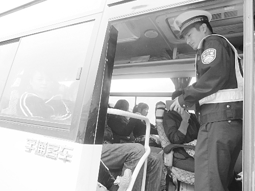 为进一步加强客车管理,营造良好的行车秩序,高速交警鹰手营子大队根据辖区营运车辆运行特点,派出警力深入辖区服务区、承唐主线站对过往客运车辆进行安全检查。图为民警在检查客运车辆的相关证件。