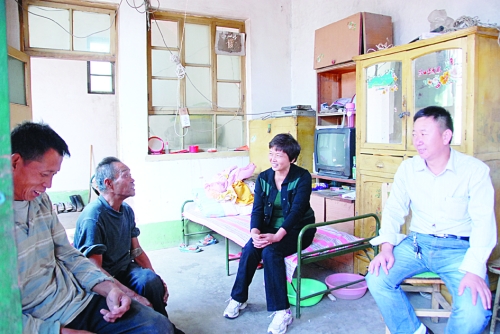 武安冶陶镇赵峪村村民邢振祥因车祸腰腿受伤,落下终身残疾,其弟邢振海从小患有小儿麻痹,全家生活困难。去年,邯郸市检察院驻赵峪村帮扶工作组张文华等人来到村里后,为邢振海解决了最低生活保障问题。在结束帮扶后,他们再次回到赵峪村,为村民送去了修房用的五吨水泥,还特别看望了邢振祥,并为他解决了“五保”补助问题。图为近日,张文华等向邢振祥兄弟俩了解由工作组协调资助其养女上学费用的落实情况。 刘爱国 马书平 摄