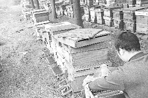 褚科峰带记者来到蜂箱前,小心翼翼地打开最上层的盖子,成群的蜜蜂蜂拥而出。“蜂箱一般分为上下两层,上层是采蜜的工蜂,下层则是负责产子的蜂王和雄蜂。”