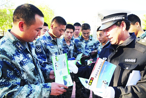 10月23日下午,沧州市公安交警二大队民警来到驻沧空军某部,向部队汽车学员和军人驾驶员共计300余人普及交通安全知识。民警围绕交通事故案例,生动地宣讲了文明礼让行车、安全驾驶预防交通事故等方面的内容,并向军队驾驶人员发放了《道路交通安全画册》和交通安全知识挂图,受到了部队官兵们的一致好评。孙明山 摄