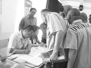 图为即将刑释人员在踊跃咨询职位情况、填写培训意向书。