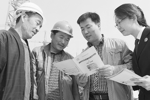 为进一步畅通监督诉求渠道,切实维护农民工的合法权益,近日,永年县司法局联合该县检察院开展“向农民工送法律‘维权套餐’”宣传活动,积极组织法律宣讲团进工厂、进工地、进车间,重点围绕劳动报酬、工伤赔偿以及劳动争议引发的纠纷等内容,向农民工讲解相关法律政策知识,引导农民工依法合理表达诉求。图为该县司法局法律工作者向农民工讲解法律知识。 胡高雷 李桂英 摄