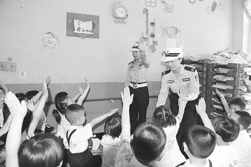 青龙满族自治县公安局紧紧围绕校园安全、交通安全,深入幼儿园、学校开展丰富多彩的宣传活动。图为日前交警大队女民警深入幼儿园,与小朋友一起玩“争做文明交通小模范”游戏,提高小朋友的交通安全意识。通讯员 戴燕山 姚飞 摄