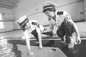 图为该局工作人员现场检测游泳池水质。 本报记者 刘波 摄