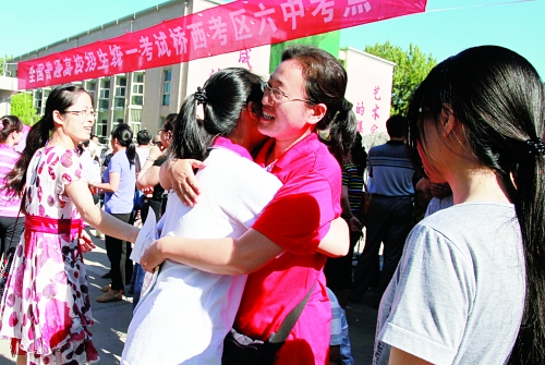 高考第一天,记者在石家庄市第六中学考点外看到,一位班主任老师站在门口,见到其每一位前来参加高考的学生便问:“文具、证件带齐了吗?”“好,那就放平心态,好好考试,加油!”然后和他们一一拥抱,为他们加油打气。