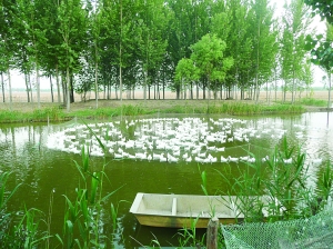 今年5月,在白洋淀水乡韩村采访,走在村边或堤上,不时看到有成片成片的鸭群,或在岸上笨拙地行走,或在水中悠然地嬉戏,宛若变幻着的白云、絮朵儿。不过,我忙于采访关注的问题,无时间也无心思欣赏。一天,终于将计划的采访完成,一身轻松的我从淀里往村里走,路过两处养鸭人家,又逢鸭群。当时夕阳西下,牧鸭人在用栅栏围成的院里露天席地吃饭,而池塘里的鸭子在水中排队游动,游成一个大大的圆形,圆形又在不断地飘动、变化着,好似在表演着一个开幕式。黄昏的水乡渐入宁静,鸭群传出的吱呀歌唱,呱呱叫声,却不绝于耳。那情景分明是一幅水乡风情画,又好似一首鸭歌交响曲。