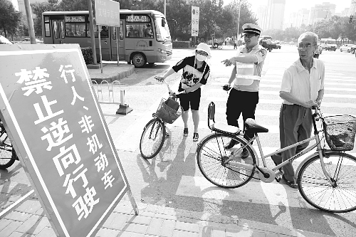 自6月5日起,冀中公安局交警支队组织民警在车流量大的路段,查纠非机动车和行人闯红灯、逆行、停车越线等交通违法行为。图为民警引导行人遵守交通法规,文明出行。 通讯员 毛少杰 摄