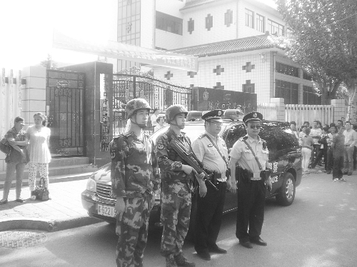 高考期间,张家口市公安局巡警支队加强武装巡逻为考生保驾护航。图为巡警支队四大队民警与武警在该市正博中学执勤。 徐林顺 摄