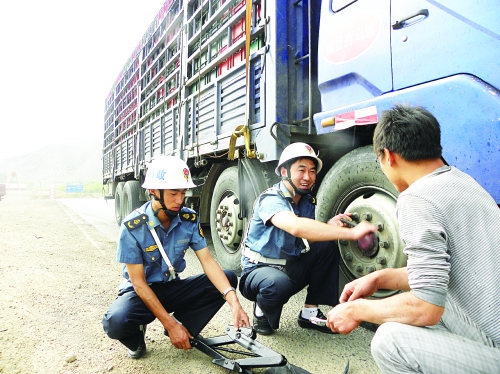 万全县公路路政管理所在践行党的群众路线教育实践活动中真心实意为群众办实事、做好事,汇聚推动发展的正能量。图为路政员在207国道万全段的山路上为货运司机修车。