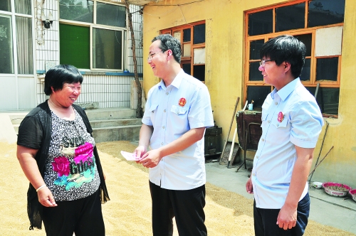内丘县人民法院在党的群众路线教育实践活动中,以加强执行工作为重点,以“麦收、秋收、过年”三个时间节点为执行良机,既注重严格执法,又注重为民服务,不断树立法院和法官的良好形象。图为今年麦收期间,为不耽误农民农时,该院执行法官及时将执行来的标的款送到申请执行人家中。