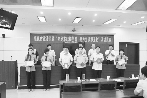6月17日,为推动全市政法系统党的群众路线教育实践活动深入开展,鹿泉市委政法委组织开展了政法系统 “立足本职铸警魂,我为党旗添光彩”主题演讲比赛活动,以此来展现政法干警爱岗敬业、乐于奉献、服务群众、执法为民的精神风貌,进一步增强政法干警服务群众的意识和决心。图为为演讲比赛获奖者颁奖时的情景。