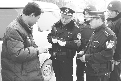 2015年严打严防严治战役开展以来,鸡泽县公安检查站迅速行动,有效发挥盘查、布控堵截作用,加大对非法运输管制刀具、携带枪支、爆炸、化学性危险物品的可疑车辆、人员的盘查力度,加强对无牌无证机动车、酒驾、醉驾等交通违法行为的查处,出租车出城登记,截断各类违法犯罪分子进出辖区的通道,取得明显成效。图为民警在进行盘查。 刘鹏 摄