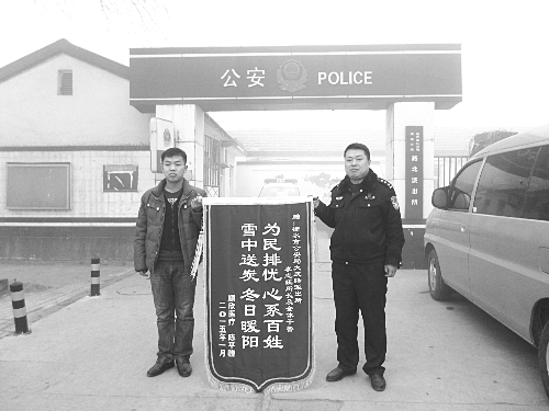 近日,市民陈某在返回衡水途中,其所开汽车因无油在北外环附近抛锚,遂拨打110求助。桃城公安分局路北派出所民警接警后,驱车带陈某买来汽油,为其解了燃眉之急。事后,陈某将一面锦旗送到派出所,对民警表示感谢。