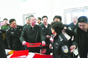 上午11时许,副省长、公安厅厅长董仚生,在厅党委委员、政治部主任史贵中等陪同下来到现场。董仚生向书画家逐一问候,向等待求字的机关民警、工勤人员、武警战士和离退休老同志颔首致意。有书画家写下一个大大的“福”字,送给副省长,董仚生高兴地道着谢,双手接过,献给了旁边一位民警。