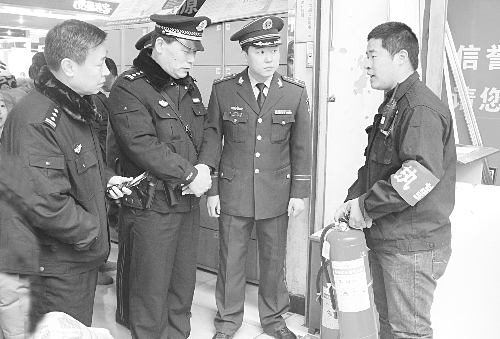 2月6日,高邑县公安局出动120名警力,在商业繁华区、主要交通干道等区域,集中开展宣传、巡逻、打现行工作。当天,民警共发放《防范电信诈骗》、《烟花爆竹燃放知识》等宣传材料7000余份,处置各类纠纷21起,接受群众求助56人次。图为该局局长胡玉兵(左二)带队检查购物广场消防安全。
