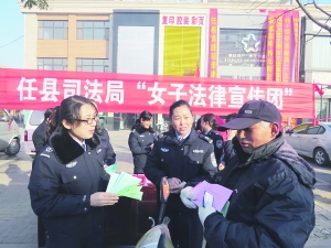 “六五”普法活动一开始,任县司法局就精心挑选出10名女同志组成女子法律宣传团,把普法宣传的担子压在了她们的身上。女子法律宣传团常年活跃在城镇、乡村和群众身边,开展法律“进企业、进家庭、进市场、进学校”等“法律八进”活动,撑起了任县普法的“半边天”。
