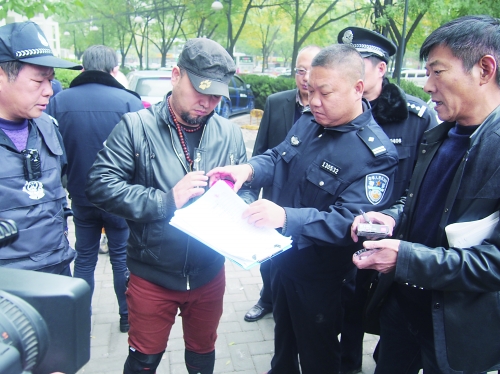 11月9日,唐山市中级人民法院执行局组织50多名干警,奔赴北京市朝阳区,依法对此地的一处房产进行清场,目的是将已拍卖成交的被执行人的房产交接给付买受人。此前,执行干警已多次做被清场当事人的工作,要求其自动清场,但其始终置之不理。当日执行干警赶到现场,经过3个多小时的努力,完成清场。图为被清场的当事人在物品登记表上签字。 本报记者 刘文利 摄