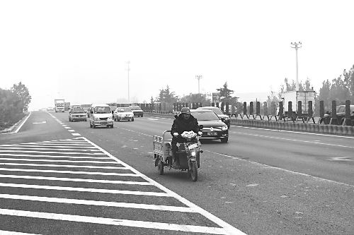 石家庄南二环大桥是禁止非机动车通行的,也有明确的禁止标示。可就是这样仍有不少非机动车在二环路上与机动车“并驾齐驱”。这样的行为不仅给自己带来危险,也给道路交通造成安全隐患。图为在南二环建设大街口,非机动车违法上路行驶。