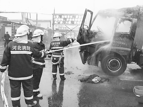 11月17日下午, 307国道井陉县长岗段,由山西昔阳县拉煤至石家庄的一辆半挂车与前车发生追尾事故,驾驶室随即燃起大火,所幸驾驶员成功逃出,没有造成人员伤亡。井陉消防中队接到报警后,出动两部消防车和10名官兵迅速前往现场救援。消防官兵在现场指挥员的指挥下,迅速用水枪将火扑灭。