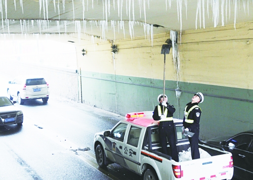 连续几天的降雪使气温骤降,沧州市解放路立交桥的桥洞内垂下数根锋利的冰柱,对从此经过的车辆和行人产生安全隐患。11月25日9时许,沧州市公安交警二大队四中队民警在巡逻时看到该隐患后,带上铁锨对桥洞道路上方的冰柱进行清理。两个小时后,终于将冰柱清理干净。