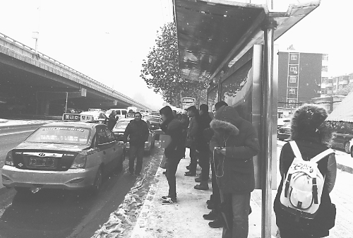 “南焦客运站,每位10元,还差一名。”连续降雪加上气温骤降,给省会道路交通带来很大压力,许多市民采取拼车打的的方式出行。图为11月25日10时,在南二环桥西区政府门前公交站上,出租车司机正在违规揽客。