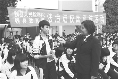 魏县检察院未检部门干警日前来到县实验一中,把伤害、盗窃等典型案例通过情景剧表演和现场互动的形式,向学生开展法治宣传教育,深受师生欢迎。 任寒霜 摄