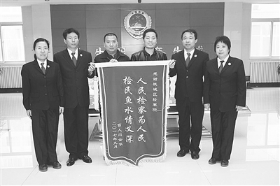 本报讯 (薛妍 陈鑫欣)“我是特意来给咱检察院送锦旗的,多亏了人民检察官,替我伸张了正义,讨回了被骗钱财,我非常感激,送面锦旗表达表达我的心意。”日前,盲人阎某在家人的陪同下,将一面写有“人民检察为人民,检民鱼水情义深”的锦旗,送到了衡水市桃城区检察院,并紧握该院检察官的手连表谢意。