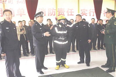 图为石家庄市长安公安分局副局长李永来与消防战士现场向参会人员介绍怎样正确使用消防器材。本报记者 张世杰 摄