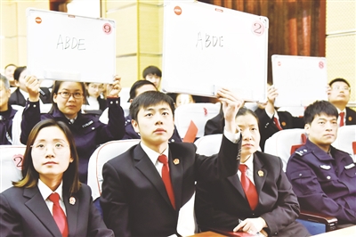 为持续掀起学习党的十九大精神热潮,11月10日,石家庄市裕华区人民法院在大审判庭举办了党建、党史知识竞赛,14个小组参加了角逐。此次竞赛形式灵活,大家在积极参与的过程中不断巩固学习成果,达到了以赛带学、以学促用的目的。图为竞赛现场。 记者 杜宇鹏 摄