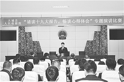 11月10日下午,大城县人民检察院组织全体干警开展“诵读十九大报告,畅谈心得体会”专题演讲比赛。10名干警先后登上演讲台,选取党的十九大报告中的一段进行朗读,并声情并茂地畅谈了自己对党的十九大精神的理解。图为干警登台演讲。 本报记者