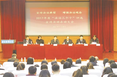 本报11月20日讯 (记者 任俊颖)在全国上下正在掀起的学习宣传贯彻党的十九大精神热潮中,河北省2017年度“法治三个十”评选宣传活动启动仪式暨“十大法治人物”代表进高校宣讲法治活动今天在河北经贸大学举行。省委政法委副秘书长、省委法治河北建设领导小组办公室副主任刘永志主持启动仪式并宣布评选活动正式启动。