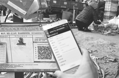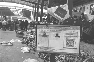 在桥西蔬菜批发市场推广会现场,技术人员演示了食用农产品实现溯源的过程。食用农产品经营户通过一部智能手机登陆管理账号后,可以随时将所经营农产品的进货记录上传,进货记录的信息内容包括,农产品的品种、产地、数量以及检验合格证等。在每个食用农产品经营户的摊位前,均张贴着一张二维码。其他食用农产品批发商或消费者,通过手机扫描二维码,就可以获知菜品销售的相关信息了。