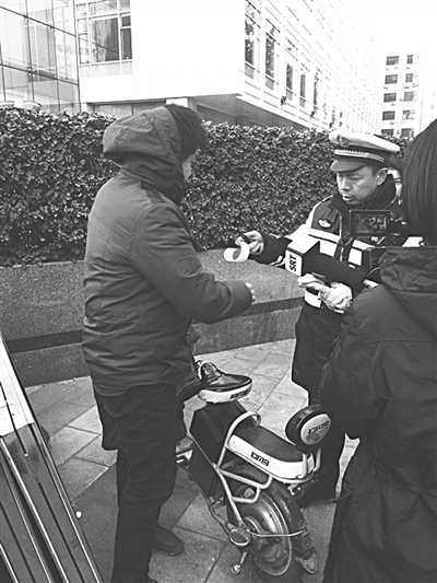 11月21日,石家庄长安交警大队结合“大整交”要求,在市区中山路与青园街交口整治查处非机动车以及行人的违法行为。图为交警正在给违章电动自行车开罚单。 刘涛 摄