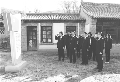 近日,张家口中院第六党支部(民一庭)全体党员到桥西区东窑子镇东湾子村察哈尔农民协会旧址参观学习,认真开展“党员活动日”活动。图为支部书记海延林带领支部全体党员在察哈尔农民协会旧址前重温入党誓词。