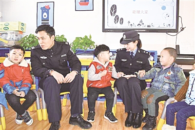 为增强幼儿对伤害的辨别能力,提高自我保护意识,邯郸市邯山区政府机关幼儿园邀请辖区民警,结合实际情况,多角度、多方位为孩子开展“防欺凌、防侵害”安全教育。图为11月30日,警察叔叔阿姨在幼儿园和孩子们开心交谈。