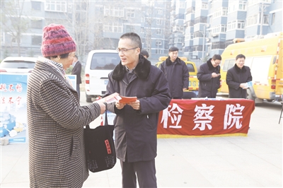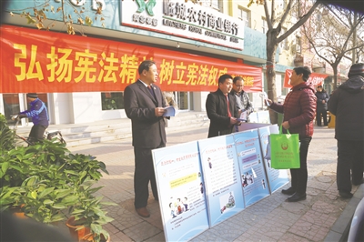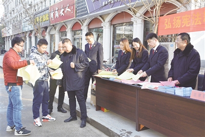 | 邯郸市峰峰矿区检察院组织干警走上街头开展国家宪法日宣传活动。干警为过往群众发放法律常识宣传册,解答群众提问,收到良好的社会效果。 刘彦莎 摄影报道 |