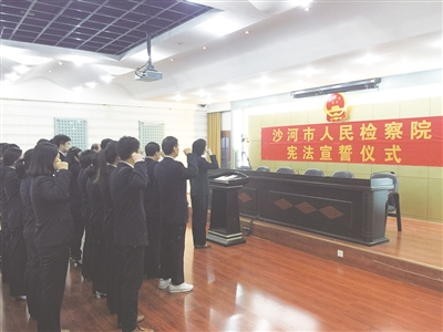 | 沙河市检察院党组书记、检察长赵丽杰带领全院检察人员进行严庄宣誓。赵丽杰勉励大家永葆对宪法的忠诚和敬畏,牢记誓词,铭记誓言,不忘初心,牢记使命,扎实做好各项检察工作。 李振光 摄影报道 |