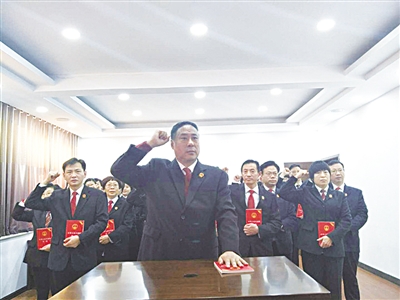 武月江希望通过此次宣誓,让全体法官进一步提升法官责任担当和法官职业尊荣感、使命感,在以后的立、审、执工作中,恪尽职守,公正司法,提高审判质效,推动法院工作再上新台阶。图为 全体法官进行宣誓。