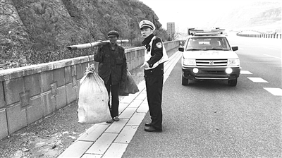 为防止行人上高速公路引发交通事故,高速交警鹰手营子大队近日与辖区路政、收费部门开展联合行动,对破损的高速公路防护网进行检查修缮,劝离擅自进入高速公路的行人,对车辆在高速公路上下乘客的现象进行非现场图像采集。图为民警正在劝离一名拾荒男子。