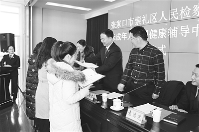 12月14日,张家口市崇礼区检察院未成年人心理健康辅导中心揭牌。该中心不仅承担未成年人刑事检察工作中的约谈、会见、帮教关护、心理矫治、权益维护等职能,同时也面向全体未成年人群体,提供集普法教育、心理疏导为一体的社会保护服务,从源头上消除未成年人犯罪隐患。图为该中心向外聘心理健康辅导教师颁发证书。 本报记者 梁燕 摄