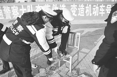 12月13日,香河县交警大队举行假牌销毁仪式,对全县交警查处的400余副假机动车号牌进行了集中公开销毁。图为仪式现场,交警用切割机将收缴的假牌照切成碎片。
