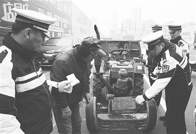 12月14日下午3时30分左右,一辆闯禁行的拖拉机在沧州市区东风路路段内行驶时,被冒雪执勤的交警当场查扣,执勤交警发现该拖拉机前方牌照悬挂在一个私自制作的木板上,并且字迹模糊,后方牌照上的数字已经模糊不清,驾驶人自称是给朋友帮忙拉一些建筑工具等货物。随即,执勤交警将拖拉机依法暂扣。