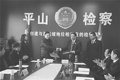 12月21日,河北大学政法学院与平山县人民检察院举行共建实践教学基地揭牌仪式。这种检校合作共建的方式,将实现高等院校与司法实务部门的资源共享和优势互补,有利于培养面向司法实务的新型法学人才,提高干警的法学素养和业务水平。图为双方签订共建协议现场。 本报记者 张哲 摄