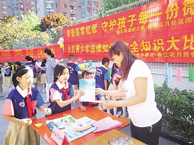 为培养青少年知法、懂法、学法、用法能力,引导青少年学会运用法律保护自己,预防未成年人违法犯罪行为的发生,石家庄市桥西区新石街道司法所联合街道团工委、妇联、春江花月社区居委会,于5月30日在春江花月小区开展社区“青少年法律知识、安全知识大比拼”活动。工作人员精心布置的知识问答七彩墙,吸引了放学回家的小学生们积极参与。工作人员向孩子们发放了《石家庄市未成年人基本文明礼仪规范指南》,引导规范青少年日常行为。活动现场,也吸引了不少居民驻足观看,纷纷领取“律师顾问、公证顾问”平台及扫黑除恶普法宣传彩页。图为活动现场。