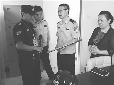 为保障校园安全,进一步加强保安人员的安全防范意识,日前,石家庄市公安局桥西分局红旗派出所组织民警到辖区小学和幼儿园,开展安全检查活动。图为民警在辖区幼儿园保安室检查保安防暴器械的配备情况。 本报记者 牛鸿飞 摄
