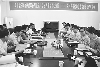 6月1日,河北世纪联合律师事务所组织合伙人和党员律师代表一行17人前往陕西省延川县,看望慰问“1+1”中国法律援助志愿者——该所律师白玉。去年该所青年律师白玉从全国范围内的报名者中脱颖而出,成为了“1+1”中国法律援助志愿者中的一员,于去年7月份被派往陕西省延川县开展为期一年的法律援助工作。慰问组实地考察了“1+1”法律援助工作情况,并向延川县法援中心捐赠了四台电脑和十部法律书籍。图为该所与当地法援中心召开的慰问座谈会现场。 张书亮 摄