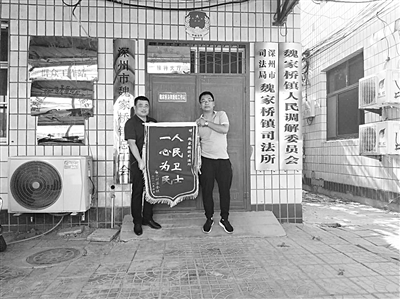 6月4日上午,深州市魏家桥镇某村七十岁的苏大爷来到魏家桥镇司法所,对司法所工作人员说:“感谢司法所为我劳碌奔波,现在我的问题已经解决了,真的太感谢大家了!”并送上锦旗。