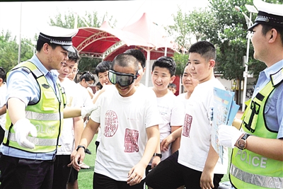 暑假即将来临,沧州市公安交警二大队宣教民警深入辖区内各学校开展交通安全宣传教育活动。民警们通过发放交通安全知识宣传页、展板互动、交通安全知识问答等形式,向学生们宣讲交通法律法规,普及交通安全常识。同时开展“醉酒眼镜”实践活动,让学生们戴上“醉酒眼镜”体验醉酒后的视觉效果,以此向学生们宣讲酒后、醉酒驾车带来的危害,倡导学生们时刻提醒和劝导家长不要酒后驾车,安全出行。图为6月26日上午,在沧州市第二实验小学,一名学生戴上“醉酒眼镜”体验饮酒后的视觉变化。 孙明山 摄