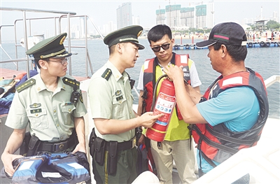 气温渐高,秦皇岛逐步迎来旅游旺季。为确保游客安全,近期,秦皇岛市公安边防支队各边防派出所加强对沿海旅游景区旅游船只和沙滩摩托的安全管理工作。图为山东堡边防派出所民警在金梦海湾浴场检查旅游快艇安全设施配备情况。